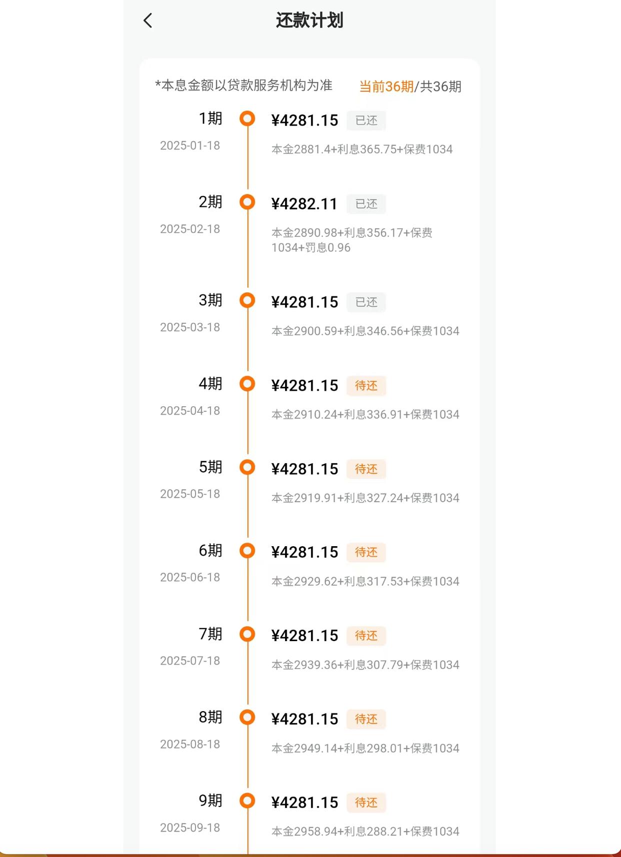 從其還款計劃來看,2025年1月(1期),其需還款4281.15元,其中,2881.4元為本金,365.75元為利息,1034元為保費,后續(xù)月份,總還款額不變,但還款中的本金逐漸增加,利息逐漸下降,保費仍為1034元/月。